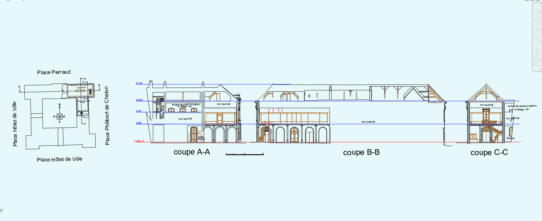 Le but premier de l’intervention était le relevé d’un angle retour d’aille sur la partie musée ou se trouve de gros désordres de façade (relevé extérieur, salles intérieur adjacent a l’angle et combles) pour exécution des tracé 2D, plans de niveaux, coupes.