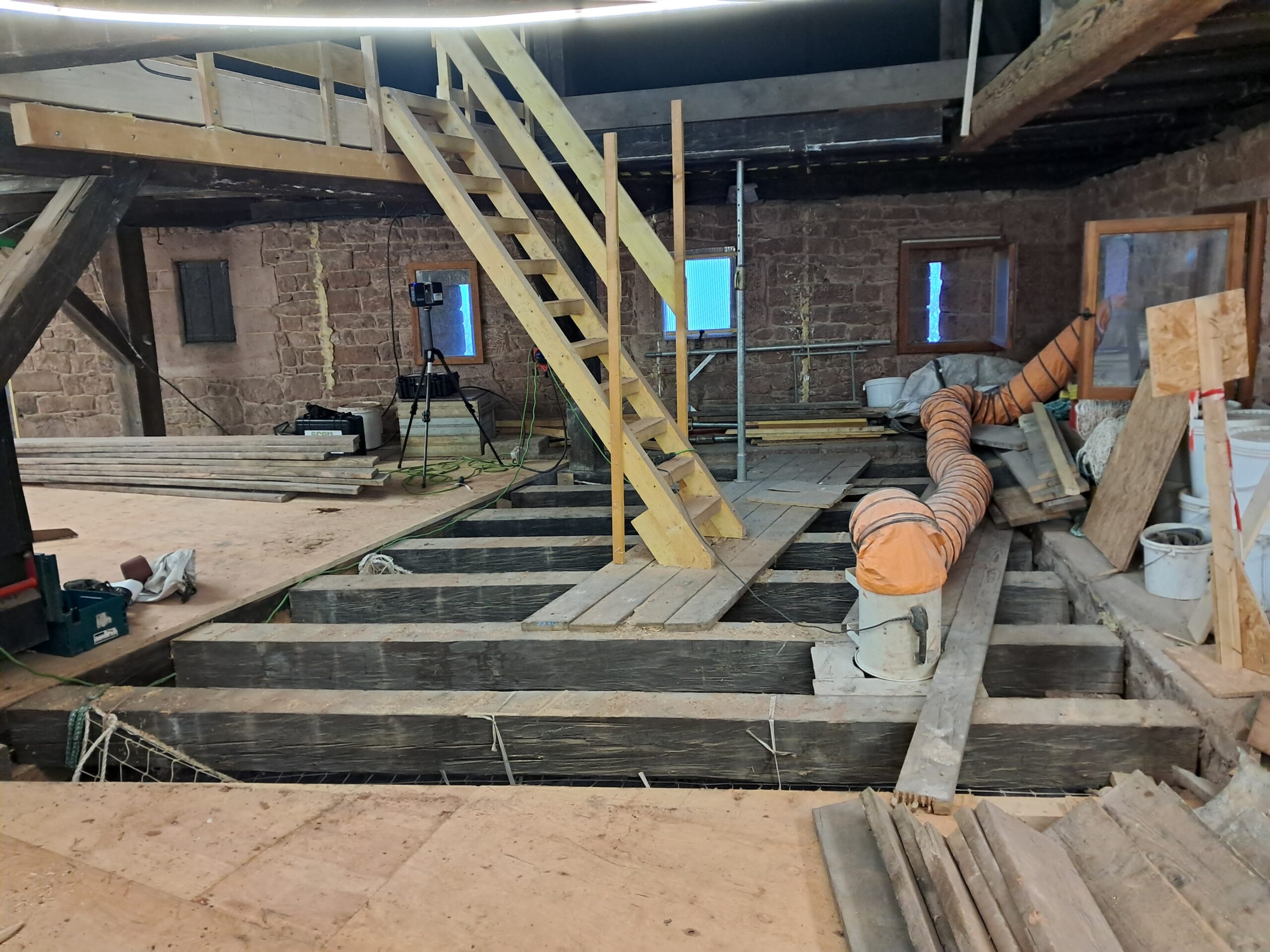 Direction l’Alsace plus précisément le Château de Haut Koenigsbourg. Relevé d’une trémie pour le futur escalier sur 3 niveaux situer aile nord du bastion de l’étoile. Une meilleure compréhension des lieux et position exacte des ceintures de trémie va faciliter le travail du métallier en charge de la fabrication structure de l’escalier qui ensuite sera habillé de bois.